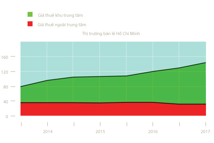 Đầu năm 2017, Tp.HCM chào đón 2 dự án nhỏ mới là Sense Market 23/9 và khối bán lẻ là CBD home Premium tại quận 2. Giá thuê được cho là ổn định trong hầu hết các khu vực và loại hình khảo sát. Các trung tâm thương mại tổng hợp giảm giá thuê khoảng 5% so với quý trước lại ít được quan tâm của khách hàng hơn. Tại các hình thức khác, giá thuê cũng chỉ dao động 0,1-1,2% so với quý trước.