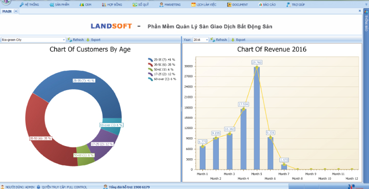 Mọi nghiệp vụ từ quản lý chuỗi dự án, kho sản phẩm, biểu mẫu, các lịch thanh toán, đặt cọc,làm hợp đồng mua bán, quản lý thu, chi theo tiến độ thanh toán, đến hoạt động quản lýchiết khấu, hoa hồng nhân viên.. đều được thực hiện trên một phần mềm duy nhất. Báo cáo được tổng hợp, chính xác đến từng chi tiết, theo từng thời kỳ, giúp công ty dễ dàng theo dõi được toàn bộ hoạt động kinh doanh, phân phối dự án trên phần mềm.