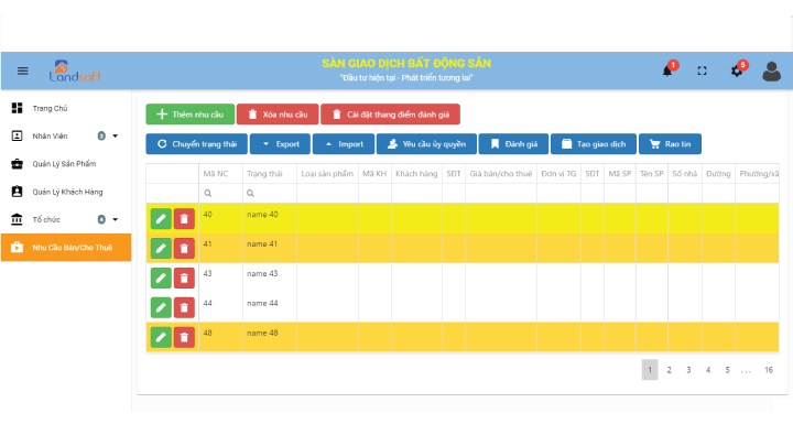 Phần mềm với tính năng quản lý sản phẩm: Người dùng có thể quản lý và xem thông tin chi tiết sản phẩm, quản lý quá trình mua bán, cho thuê của sản phẩm. Hỗ trợ người dùng nắm bắt xu hướng thị trường bất động sản, từ đó có chiến lược, kế hoạch chăm sóc khách hàng và tiếp thị phù hợp. Ngoài ra, ngay trên phần mềm quản lý kinh doanh bất động sản Landsoft Agency, người dùng có thể quản lý nhu cầu bán, cho thuê; nhu cầu mua, cho thuê; quản lý lịch hẹn tư vấn; quản lý giao dịch bất động sản; quản lý nhân viên…