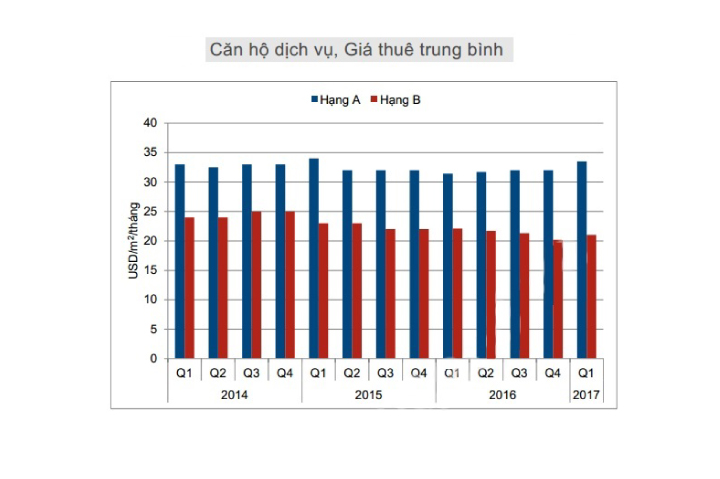 Trong quý đầu tiên của năm 2017, giá chào thuê trung bình ở hai phân khúc căn hộ dịch vụ tại TP.HCM và Hà Nội lần lượt rơi vào khoảng 34USD/m2/tháng và 27,2USD/m2 tháng